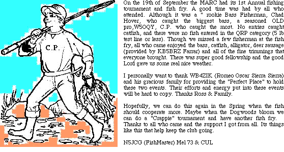 Hello to all. Was it a good month for you? Hope so. Mine was good. Fall is here and along comes the sniffles. I have mine already. Glad we missed Georges. The Mobile Hamfest wasn't too good. People didn't come because of the storm. The fishing tournament was a huge success. Everybody seem to have a good time and enjoy it. Of course the CHAMP was - I want say it; YES I will. You will want to know if you weren't there. Yes it was yours truly. Beat them bad. Of course Wes knew it before we started. ha. Still waiting on the check. We need to be thinking about a Christmas party.